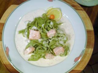 4. Лакс почти весь вынуть из кастрюли и оставшуюся часть(1/5 примерно) пропюрировать в соусе Пюрирштаб- ом. Кусочки рыбы положить обратно в соус. Соусом полить макароны.