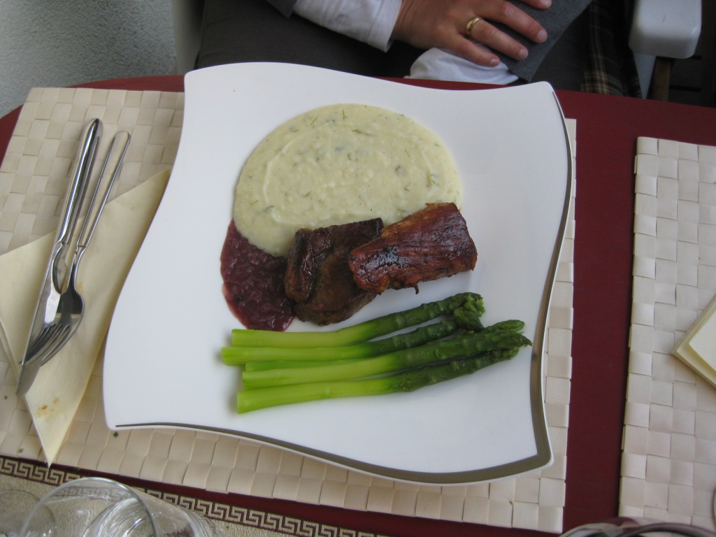 2. говяжее филе и свинные медальоны в винно-луковом соусе на гарнир зелённая спаржа (так как сезон) и чесночное ziegenkäse-пюре (как-то если в хорошом ресторане , очен понравилось)