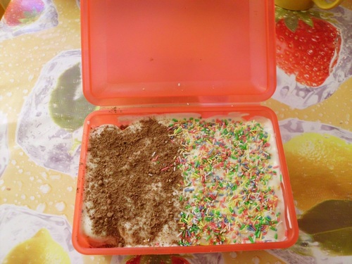 разравнять.Через мелкое ситечко обильно посыпать порошком