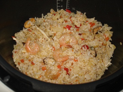 Рис обжарить на поджаривании 3 мин. 3-й уровень. Добавить перец, ананасы, креветки, посыпать специями (у меня прованские травы чуток, петрушка), поперчить, подсолить залить водой 1:1,5. Варить на мультиповаре 5 минут при 120 градусах.