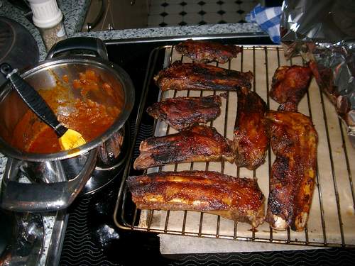 * Ребрышки посолить,поперчить, выложить на решетку и печь 30 минут при температурее 230 градусов (Umluft -210). После этого температуру убавить до 180 (Umluft-160) и часто смазывая ребрышки соусом, печь еще 50-60 минут.