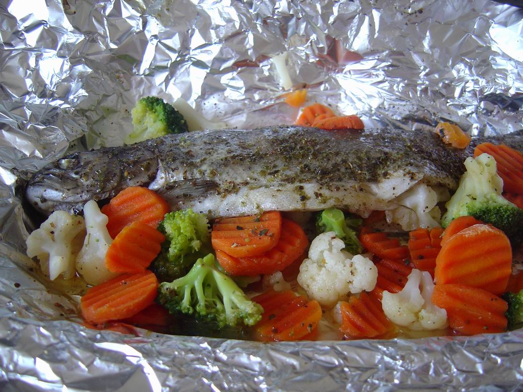 я делаю форель с овощами, без разницы, замороженные или свежие. Если есть под рукой оливки-тоже не помешает. Зубчик чесночка туда, кирштоматен. А рыбу натереть томатенгевюрц. Очень вкусно