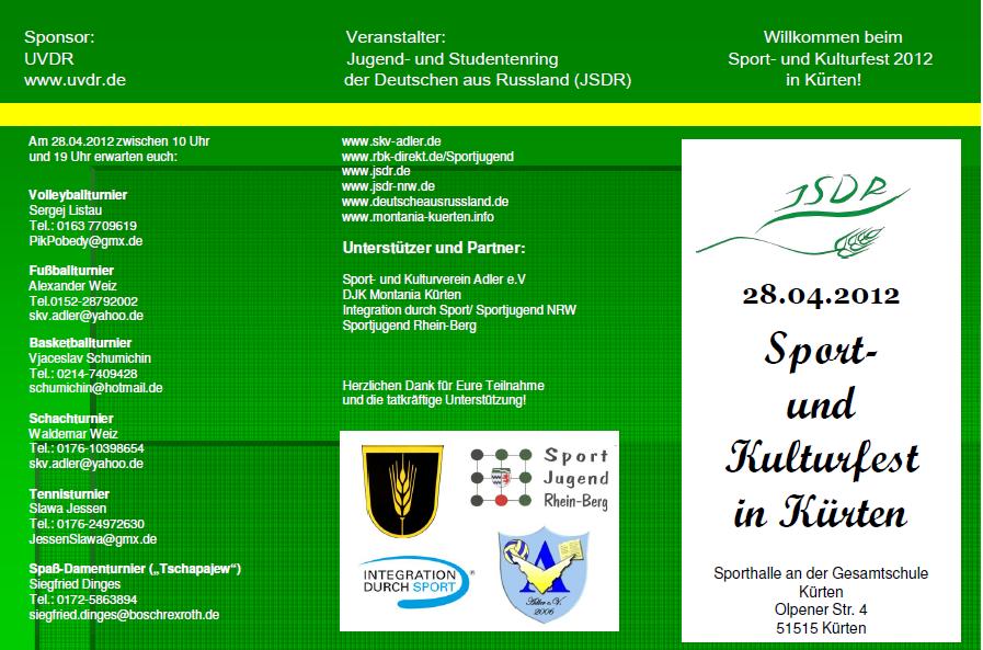 28 апреля 2012 г. в Кюртене (Rheinich-Bergischer Kreis) пройдет 5-ый ежегодный спортивно-культурный праздник Молодежного объединения немцев из России земли Северный-Рейн Вестфалия. В рамках праздника пройдут волейбольный, футбольный (мини-футбол), баскетбольный турниры, а также соревнования по настольному тенису, шахматам и "Чапаеву". Приглашаем принять всех желающих (как команды, так и отдельных спортсменов) участие в нашем празднике.
