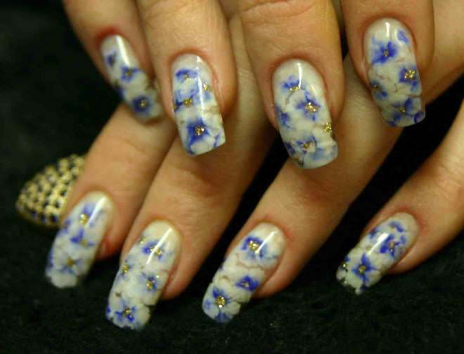 У меня много пудры цветной,специальной.Атот вариант который идут первым там я смешала прозрачный акрил с перламутровыми тенями золотого и серебряного цвета.Получилось очень красиво и нежно,но к сожалению фотка плохая