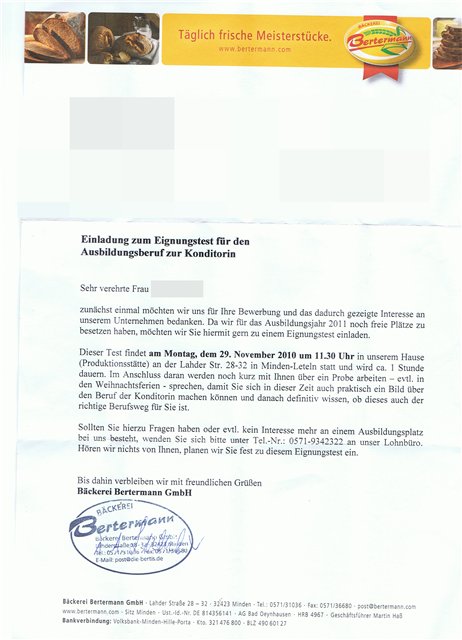 Люди!Человеки!Для меня это мега-важно.Коротко о ситуации.Я ищу аусбильдунг.И вот,наконец то мне пришло приглашение на проф.пригодность-Einladung zum Eignungstest für den Ausbildungsberuf zur Konditorin.