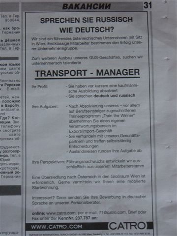 насколько я помню, это объявление от LKW Walter. Это крупнейшая транспортная фирма Европы и такие объявления они печатают постоянно. Catro - это personaldienstfirma.