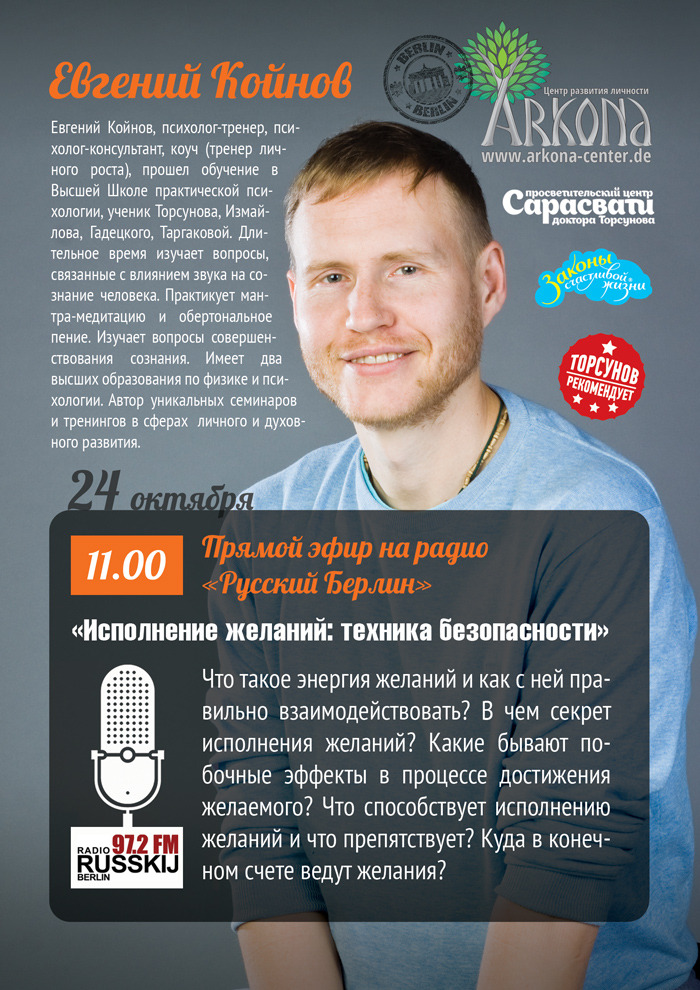 Подробные анонсы мероприятий Евгения Койнова в Берлине с 24-26 октября на сайте www.arkona-center.de