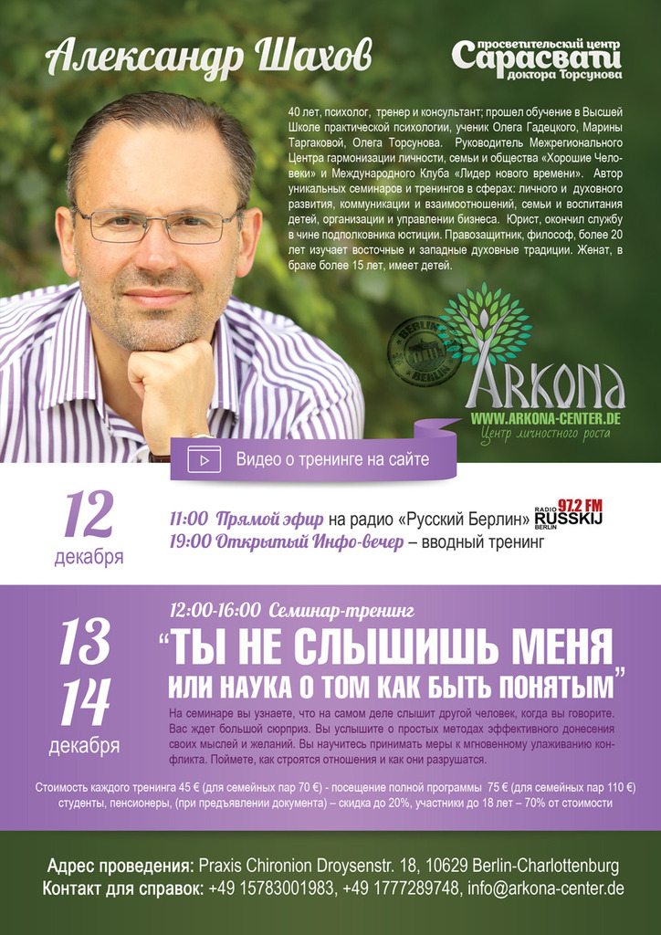 Центр развития “АРКОНА” приглашает всех желающих 13-14 декабря на следующий знаменитый семинар-тренинг Александра Шахова