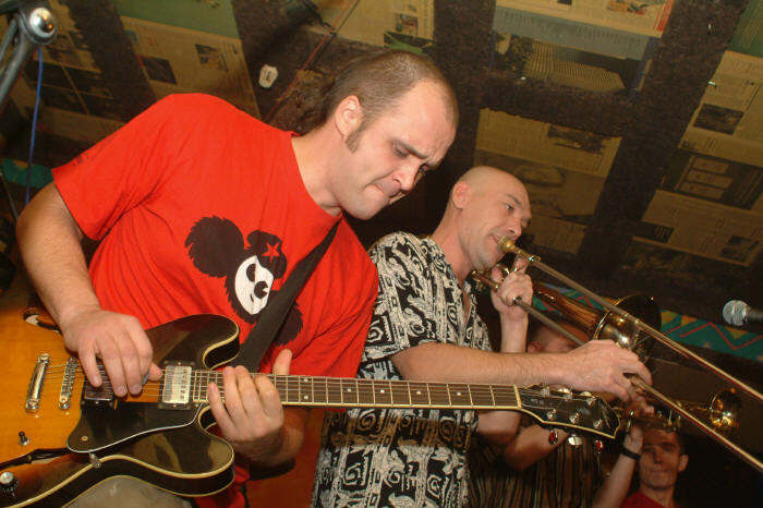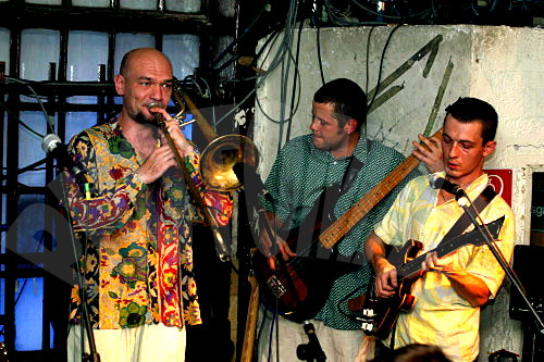 Примерно через полчаса на сцену вылезла еще одна подобная команда... чуть по-приличнее, у солиста на голове на этот раз наблюдалась шляпа и даже блестящий галстук болтался на голой шее. Все песни, правда, были похожи одна на другую и команда три раза наигранно прощалась и снова начинала ╚петь╩, с видом великого одолжения публике, которая их якобы не отпускала... было жутко неестественно и мы просто не могли дождаться, когда же они уже свалят со сцены... одурманенные парами всего, выкуриваемого в зале и запахами потной разношерстной толпы, мы уже косились в направлении выхода... когда на сцену тихо, без пафоса вышли "маркшайдеровцы" и начали настраивать инструменты. Мы замерли... И тут... началась МУЗЫКА! Спазу, с первого же аккорда она захватила и наполнила душу ощущением полного восторга и эстетического счастья! Немецкие лохматые остолопы были резво оттеснены заждавшимися ╚нашими╩, чьи глаза засветились своим, особым кайфом. Мы оказались у самой сцены, я тут же выхватила свой фотоаппарат! Ребята играли просто обалденно! В привычном наборе ударных и гитар особенно ярко выделялись саксофон, тромбон и труба... ноги сами пустились в пляс... Играют они так называемую world music.** с элементами ямайских мотивов, в стиле калипсо, рэггей, ска, а так же что-то типа центральноафриканской музыки, сильно напоминающей румбу. Вокалист мужду делом вставлял прибаутки, удачно перемешивая английские, немецкие и русские фразы. Народ раскочегарился и колбасил уже во всю! Местные немцы тоже не уступали, ведь ребята выступают в Германии уже с 1995 года и здесь их знают. Даже в этом Ройтлингеновском клубе ╚ZELLE╩ они играли уже неоднажды! Вообще, надо сказать, что группа Markscheider Kunst является одним из наиболее известных в Европе коллективов из России, исполняющих world music.** Она регулярно выступает на многотысячных фестивалях. И при этом, в отличие от большинства российских групп, выступающих за границей, подавляющую часть публики Markscheider Kunst на этих концертах составляют местные жители. (с) Через два часа безостановочного дрейва, радостные, обалдевшие, мокрые насквозь, мы всё еще не отпускали музыкантов со сцены.