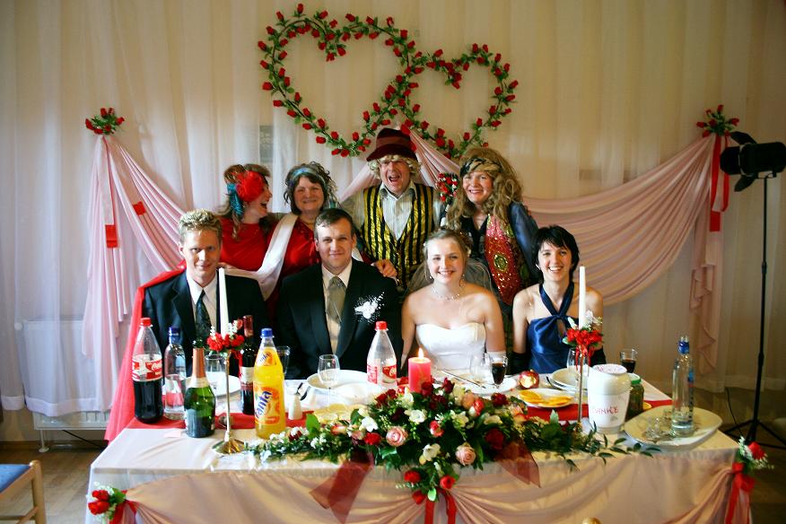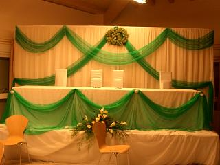 мы постелили белые скатерти...положили красные ленты по длинне стола..поставили вазочки с молодыми розочками...а стол молодых был украшен композицией из цветов а сбоку ещё ткань задрапировали розочки и ленты прикрепили...посмотри на фото..хотя там не всё видно