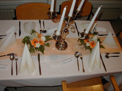 Оформлено было в неярко-розовом, белом и светло-золотистом тонах. На столы гостей шили розовые Tischläufer, посередине Blumengesteck из белых роз и две длинных белых свечи в стеклянном подсвечнике. Стол молодых был украшен как обычно драппировкой из розовой и золотой ткани, большой Blumengesteck в центре и маленькие, такие же как у гостей по краям. Сзади стояла арка с драппировкой и искуственными цветами. Хотели на края столов еще золотые банты большие прикрепить, но забыли взять с собой а потом уже не до того было.