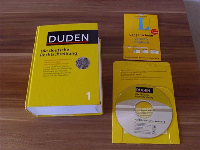 Предлагаю " Die deutsche Rechtschreibung " Дудена , 120 000 слов и 500 000 примеров ,объяснений и т.д. книга в отличном состоянии ,к словарю прилагается CD-ROM и еще штуковина , для изучения глаголов на английском языке (вот ведь , даже не знаю как назвать