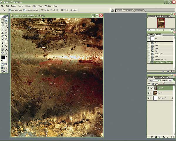 5 В панели управления слоями меняем режим наложения верхнего слоя на Overlay и снижаем непрозрачность (Opacity) до 30%.