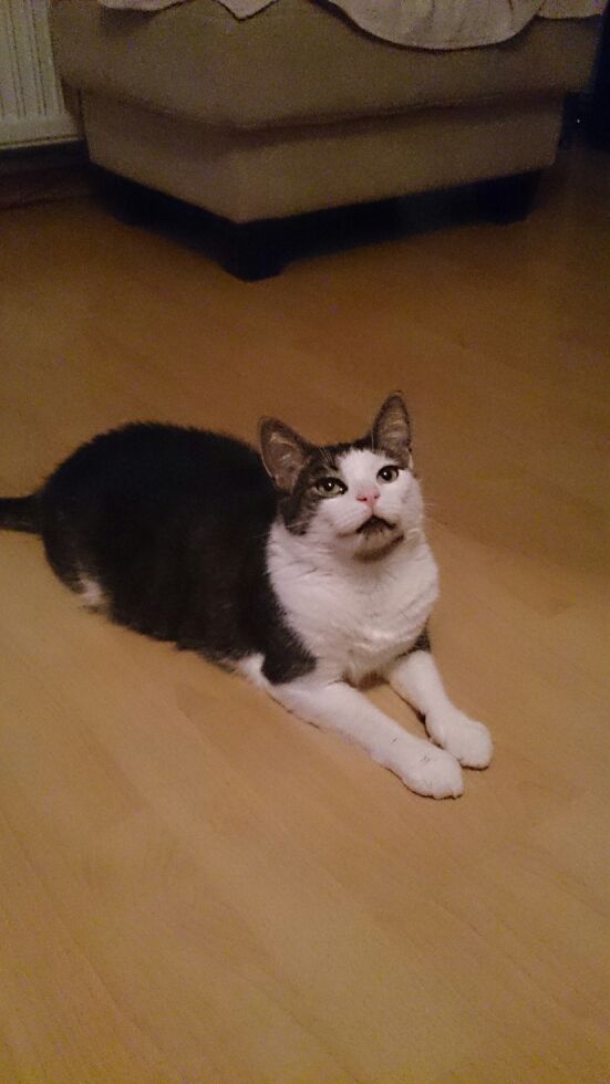 Кошечка, которая чёрно-белая немножко трусишка, боится когда громко разговаривают.