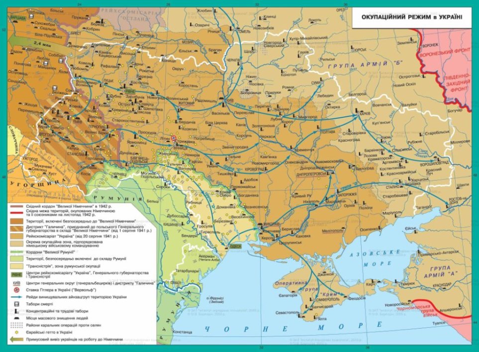 В прикрепленном файле - карта Рейхскомиссариата Украина. Если кому-то нужна в лучшем качестве - обращайтесь в личку. На форуме не могу выложить в нормальном размере из-за ограничений до 200 кб
