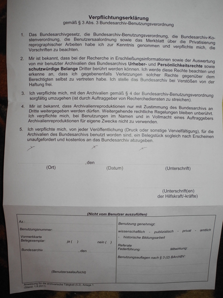 Die Erstellung der Kopien erfolgt durch Vertragsfirmen des Bundesarchivs, die Ihnen die Kosten unmittelbar in Rechnung stellen. Die Kosten für eine Kopie DIN-A-4 (Papier oder digital) liegt je Seite bei 0,43 EUR; hinzu kommen eine Bearbeitungspauschale (3,05 EUR je Auftrag) sowie Versand- und ggf. Materialkosten für digitale Datenträger. Ein Merkblatt der Firma Selke füge ich als Anhang bei.