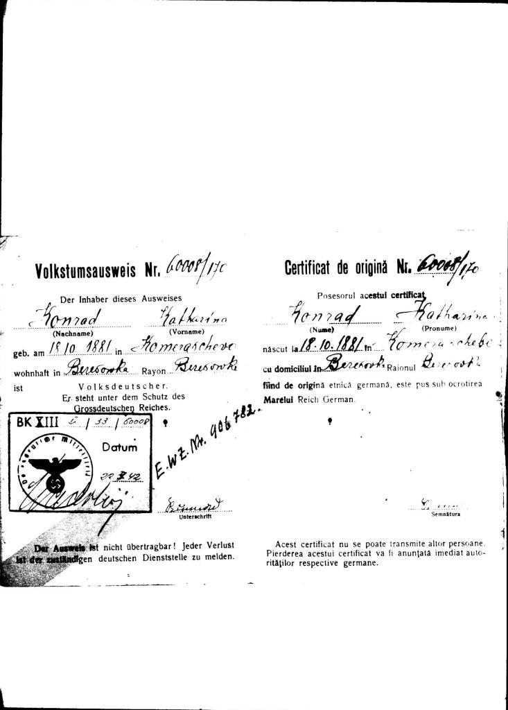 Такие же документы получили мои родители, проживая во время ВОВ в Молдавии. После переселения в Германию в 1944г., мои родители были натурализованы и взамен Фолькстумсаусвайс им были выданы свидетельства о гражданстве и Умзидлераусвайсы.
