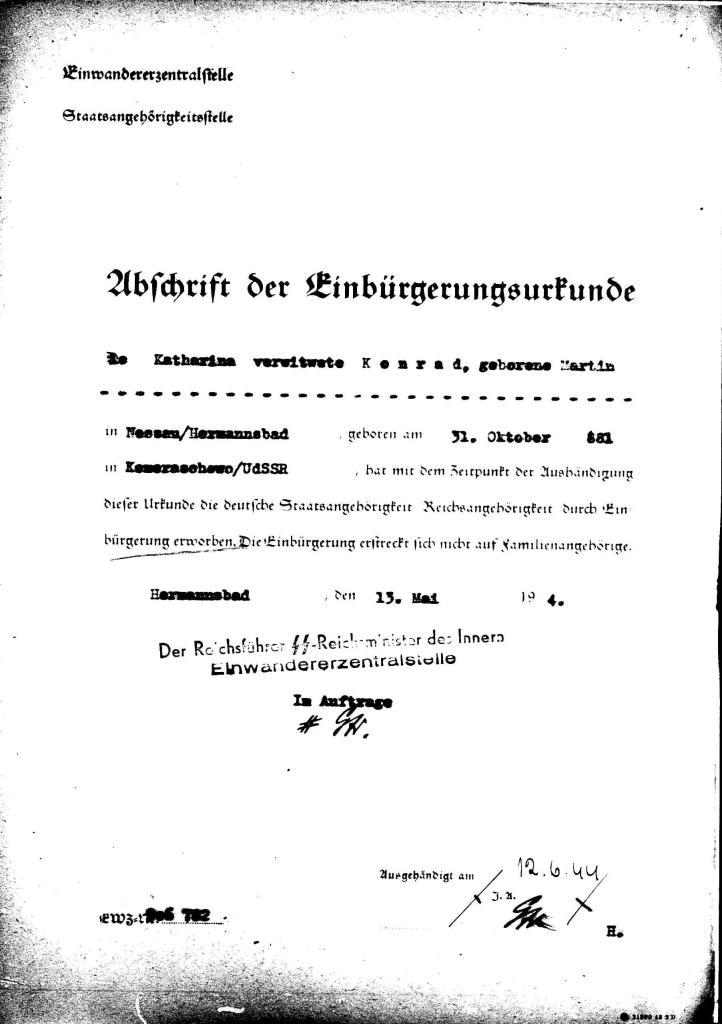 Но дата стоит 22.09.1942 года, т.е. время оккупации. Могла ли она получить гражданство еще будучи на Украине? В Германию она попала только в 1944 году, где и умерла.