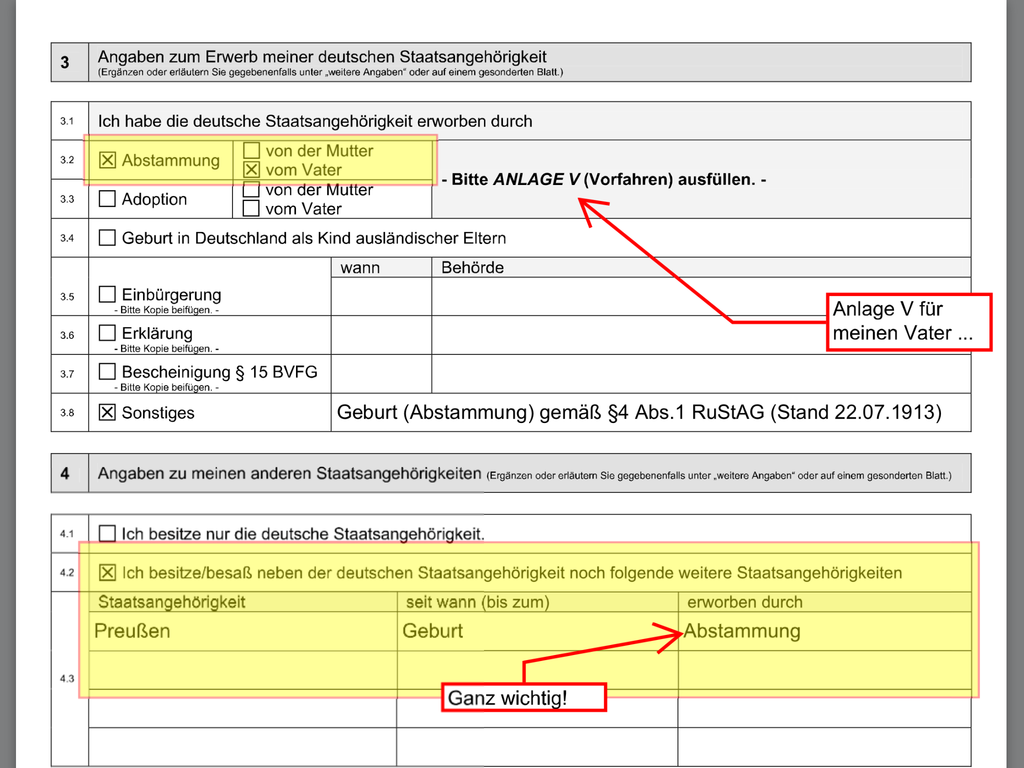 И в пункте 3.5 Einbürgerung ссылка на документ из Архива (столбец durch Behörde) в столбце wann указываете дату документа.