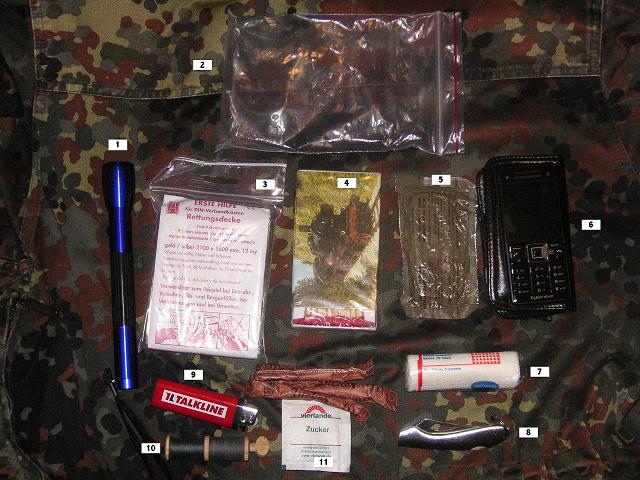 Например: средства самообороны (легальное травматическое оружие или газовый баллончик), небольшой складной нож, самые примитивные медикаменты и перевязочные материалы, фонарик, зажигалка, спички, перчатки и всё то, что может реально быть использовано в повседневной жизни и в условиях внезапно возникшей ЧС.