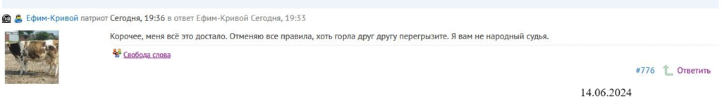 Е.Кривой сделал заявление, что рассматривает забаненную Свободу слова, как часть своего администраторского наследия. У Е.Кривого было пятнадцать групп, открытых в 15ом году. Это магия чисел, которую нельзя было нарушать. Куда Графолог одну дел? Закрыв Свободу слова, он открыл свой ящик. Похищение Свободы не пройдёт даром этому бычку. Стакан за Свободу!
