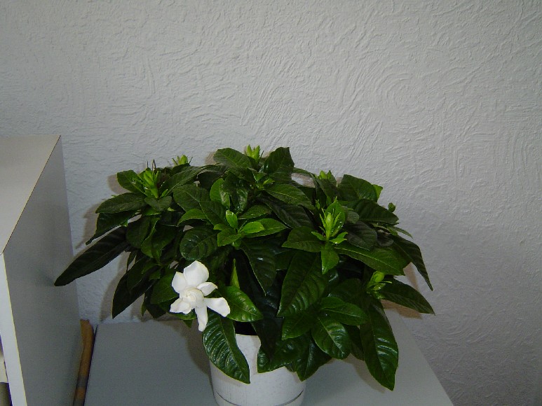 Ета гардениай совсем чахлая была, полузасушенная. Муж ее на полке цветков со скидкой нашел, по запаху (ему детство напомнило, у них росла), ну и сразу ее взял, сказал что будем возвращать к жизни прелестное создание. Она немного поросла, совсем чуточку, я по длинне листьев заметила, цветет она довольно буйно, бутоны один за одним распускаются, но я их через сутки отсчипываю, потому что сил нету это нюхать - у меня аллергия на пыльцу, я просто задыхаюсь.