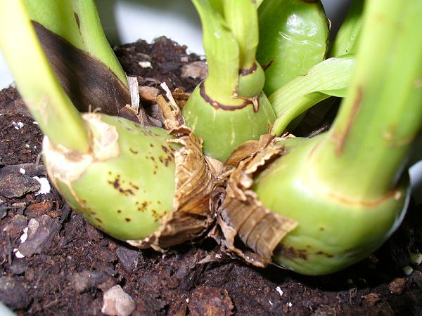 две недели назад купила цветущий Zygopitalum. еще в магазине обратила внимание на почернения на двух бульбах (из четырех), спросила продавца, он сказал, что ничего страшного...в общем отвалилось вчера три абсолютно зеленых упругих листа. бульба эта маленькая, есть белый налет (?)...может, его срезать?