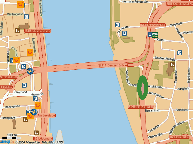 Имеется в виду остановка трамвая, _перед_ Deutzer Brücke в направлении центра (т.е. восточная сторона Рейна, рядом высотка гостиницы).