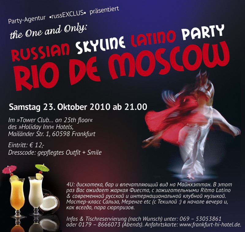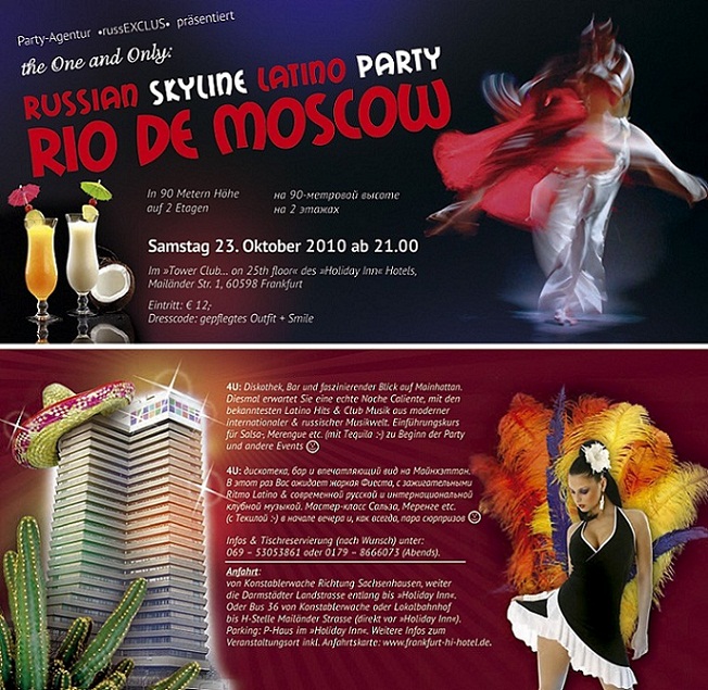 23 октября во Франкфурте на 25-м этаже в отеле "Holiday Inn" (Mailänder Str. 1) состоится очередное RUSSIAN Skyline Party "Rio-de-Moscow" от „russEXCLUS”, на этот раз в стиле Latino!!! Кроме отличного сервиса, дискотеки и шикарного вида на ночной Франкфурт Вас ожидает Мастер-класс Сальса, Меренге etc. (с Текилой