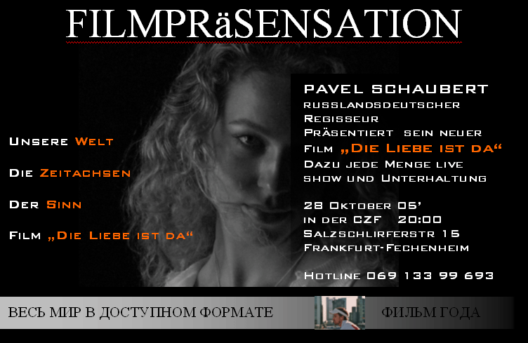 в эту пятницу организовывается презентация фильма молодого режиссёра Павла Шауберта, будет интересная программа, еда, вечер знакомств, общение, приглашаются все желающие, это совершенно бесплатно.