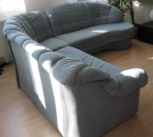 Отдаются за самовывоз бирюзово-зел╦ный кауч, около 2м х 2м, с вытягиваемой раскладушкой, недавно почищенный и в неплохом состоянии. Фото прилагается.